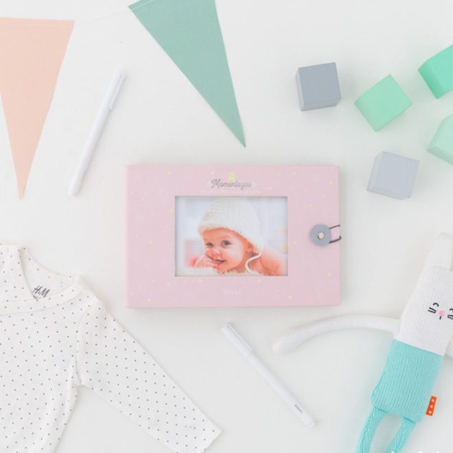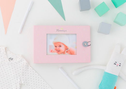 – Álbum de fotos infantil en color rosa, con espacio en la portada para poner una foto del bebé.