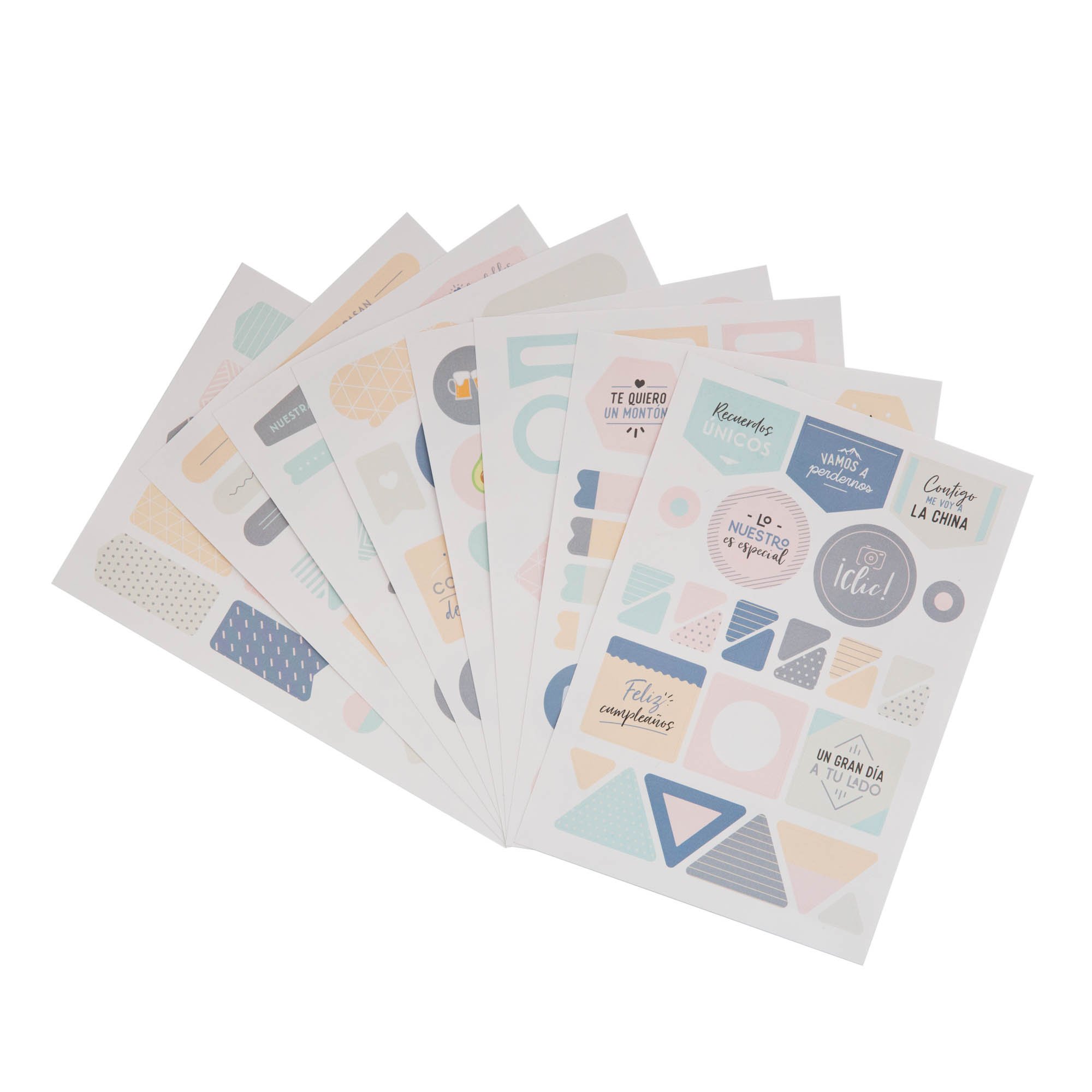 Contiene: 64 páginas para guardar fotos y recuerdos y 8 páginas extra con 182 pegatinas de diferentes colores y formas para decorarlos.