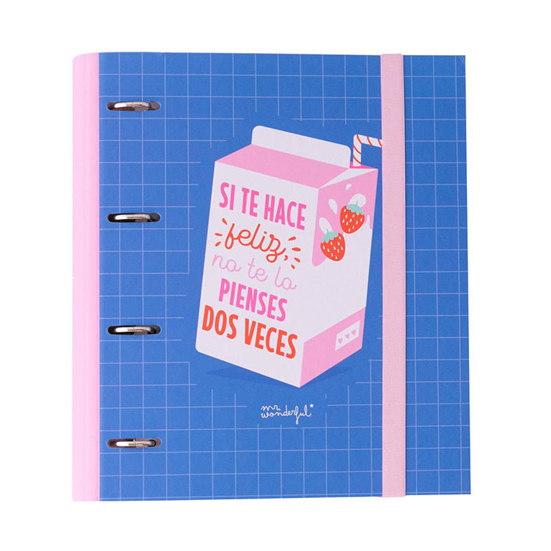 Porque además de ser superbonita por fuera, es muy práctica y útil para las clases, la ofi o ese proyecto tan especial que tienes en mente. Por un lado, sus cuatro anillas metálicas conseguirán que nunca vuelvas a perder los papeles. Por otro, incluye un paquete de 100 hojas de papel con estampado de Mr. Wonderful en su interior para que siempre siempre tengas espacio de sobras para tomar nota, garabatear y dejar volar tu imaginación. Por último, incluye un cierre con goma elástica y laminado exterior antirayaduras para que la puedas llevar a todas partes en tu bolso, mochila o cartera y que, como el primer día, se mantenga como nueva.
