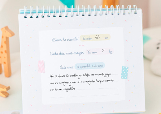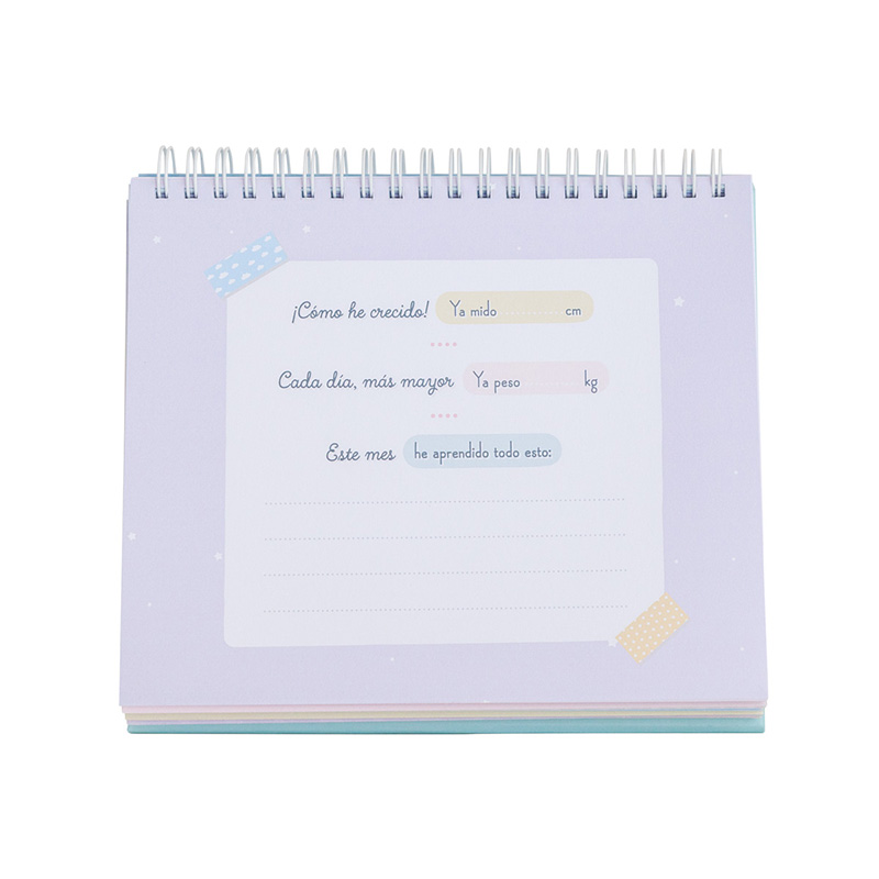 Incluye doce páginas interiores, todas ellas pautadas y con un marco para poner una foto del bebé en cada uno de sus primeros doce meses de vida. Además, en la parte trasera hay espacio suficiente para anotar el peso, la altura y lo más remarcable que haya sucedido ese mes. Todo con el objetivo de lograr, de esta manera, guardar un bonito recuerdo de su primer año. ¿A qué esperas? ¡Hazte con el cuentameses más rebonito que podrás encontrar!