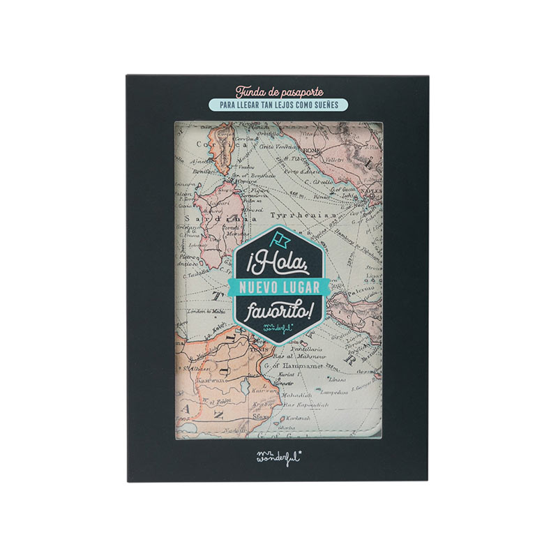 Así, en la colección Viaje de Mr. Wonderful hemos querido añadir un práctico detalle para hacerlo posible: una funda de pasaporte. Un estupendo complemento realizado en resistente PU y que es ideal para mantener nuestro pasaporte protegido y añadirle un toque de estilazo único y original. Porque esta funda para pasaporte cuenta con una llamativa frase en su parte delantera que dice: ¡Hola, nuevo lugar favorito! Así que ya sabes, es hora de elegir destino y salir en busca de ese rincón del mundo que está llamado a convertirse en tu nuevo lugar preferido, ese al que no te cansarás de volver una y otra vez.