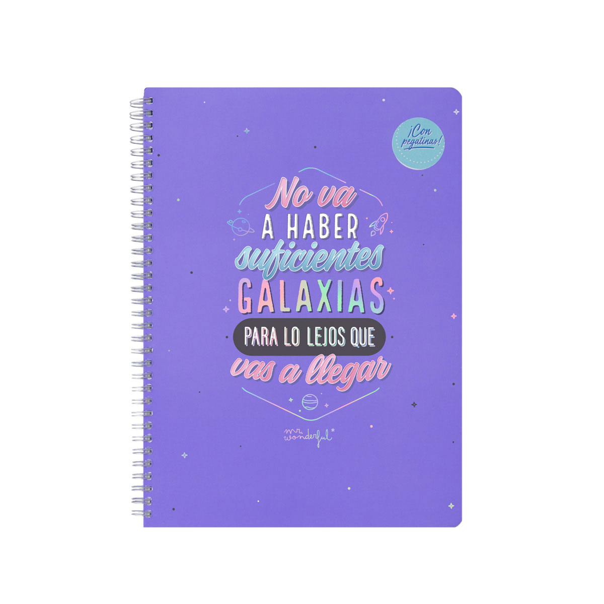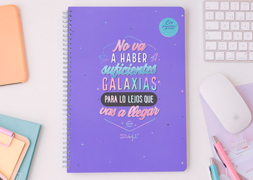 Márcate un objetivo, propóntelo, prepárate para dar el 100 % de ti, y… ¡llegarás tan lejos como tú decidas! Solo tienes que confiar en ti y no rendirte por muchos inconvenientes o imprevistos que puedan surgir en el camino. Empieza a tomarte en serio las cosas que te hacen realmente feliz y serás imparable, como las pilas Duracel o tu BFF en la sección de últimos números de vuestra tienda favorita. Como bien dice esta libreta requetebonita, si te atreves a perseguir tus sueños, “no va a haber suficientes galaxias para lo lejos que vas a llegar”.