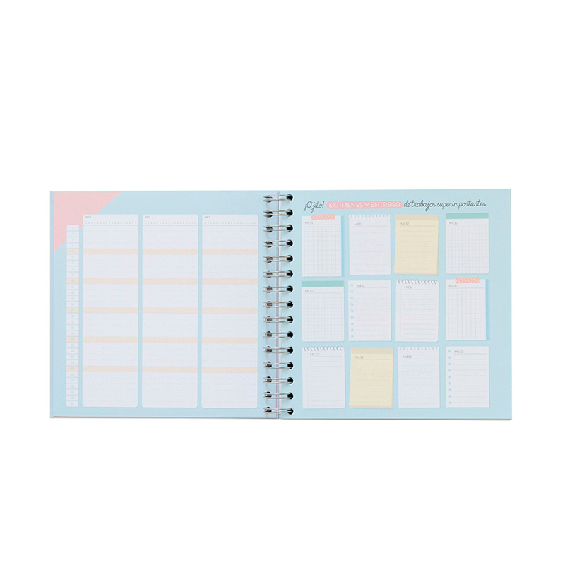 Un planificador específico para aprovechar todas y cada una de las horas de la semana, para sacarles el máximo partido y así conseguir unas notas… ¡de nota! Todo sacándole el máximo partido a nuestro escaso tiempo y, además, con consejos para estudiarlo todo todo todo y no morir en el intento, divertidas frases capaces de arrancarnos una sonrisa incluso mientras estudiamos para el examen final, un montonazo de pegatinas a cada cual más molona, tablas para anotar horarios y que no se nos escape ni una sola de las clases (escolares o extraescolares, da igual, aquí todo tiene cabida).