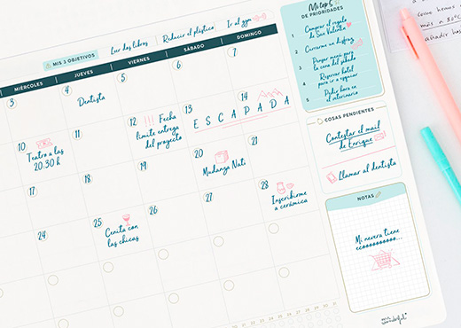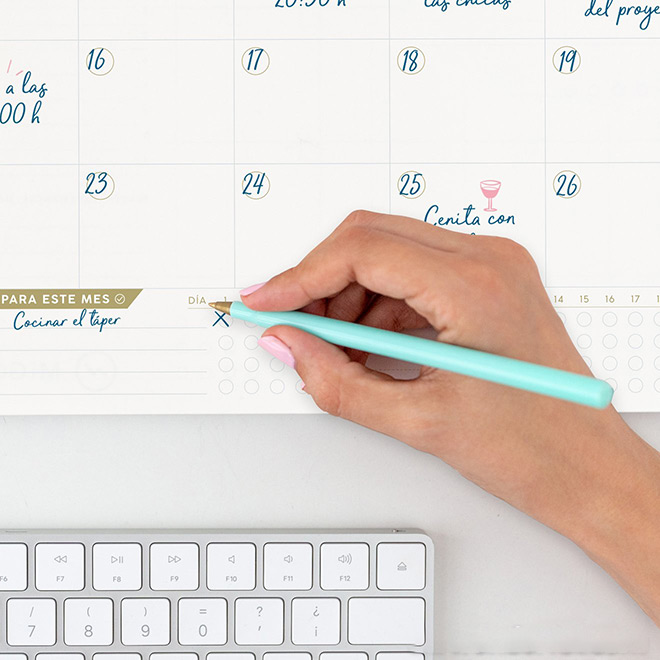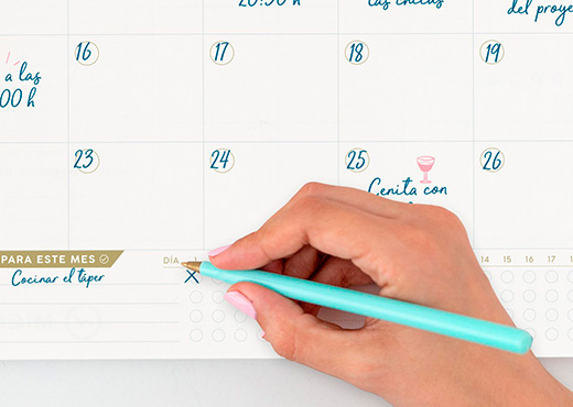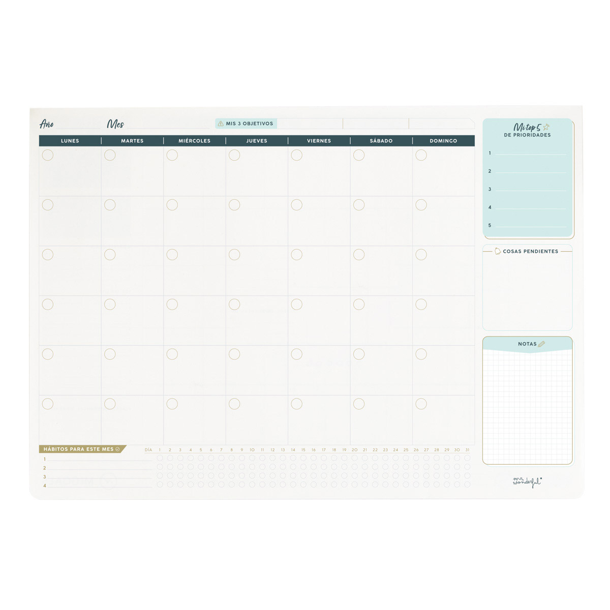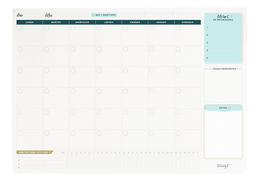 Un planificador mensual para que siempre lo puedas tener a la vista en tu escritorio. Con mucho espacio, tanto para los objetivos mensuales como para notas varias, este organizador tiene todo lo que necesitas para que, por muy frenético y veloz que pase el tiempo, no se te escape nada de nada. Sin fecha para que lo puedas usar cuando lo necesites y de tamaño A3, contiene 24 hojas arrancables (con un mes en cada una), lo que te permitirá organizarte durante dos años completos. Además, tiene un apartado especial para medir y analizar tus progresos en los nuevos hábitos que quieras conseguir, por ejemplo, beber dos litros de agua al día, subir por las escaleras en lugar de tomar el ascensor o cocinar sanote.