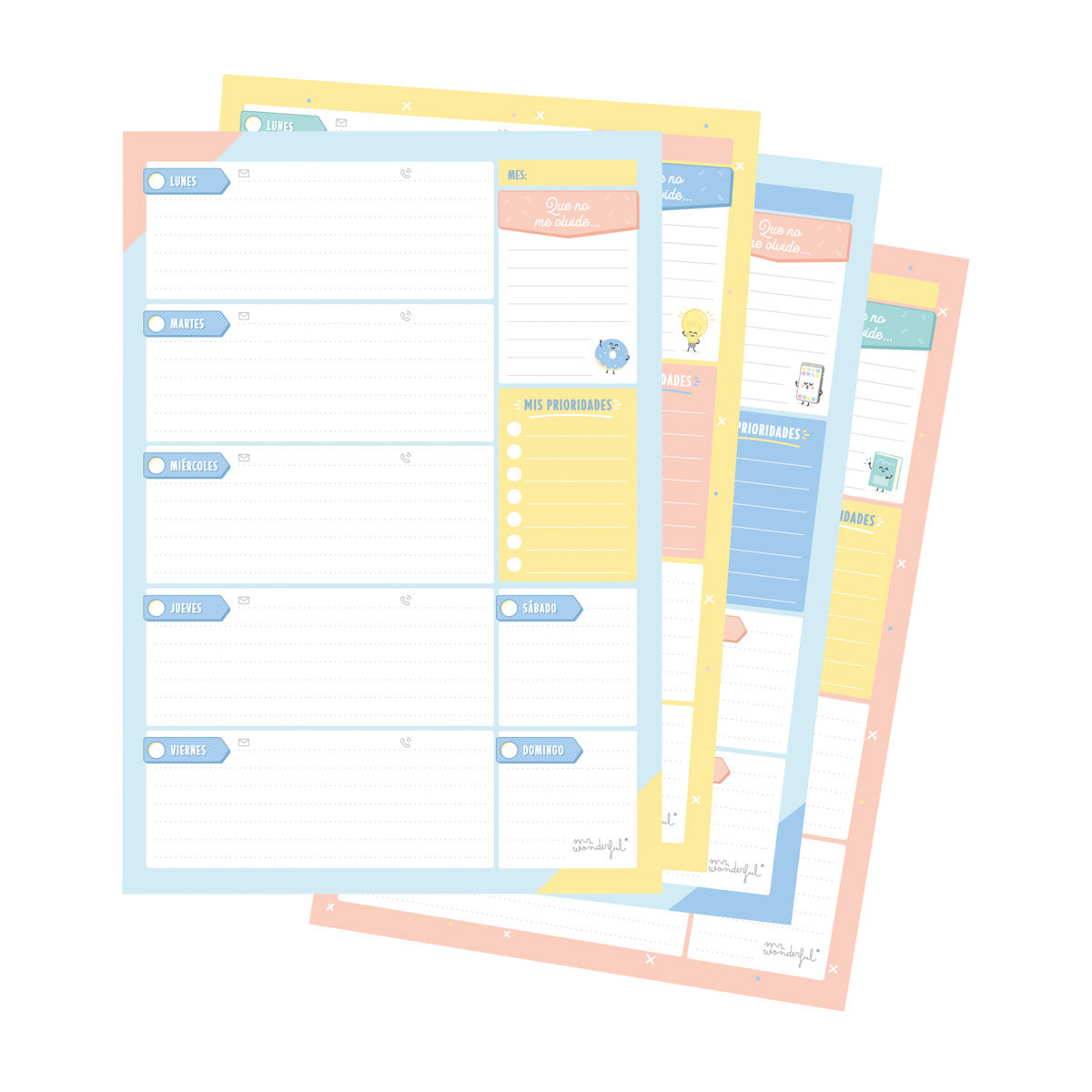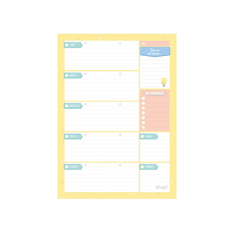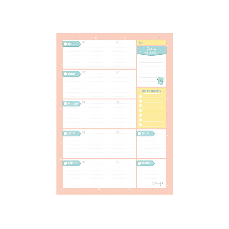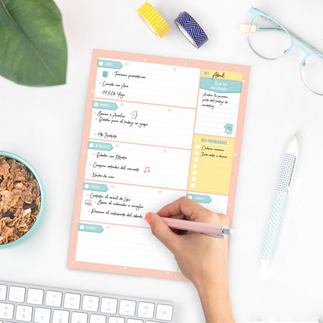 Eso significa, que cuentas con un buen espacio para anotar toooodo aquello que quieras hacer cada día. Y así, de lunes a domingo, podrás organizarte de maravilla y exprimir cada minuto. Otra cosa a destacar de este planificador semanal es que cuenta con una encuadernación encolada, por lo tanto, esto permite que se vayan arrancando las hojas a medida que se vaya cambiando de semana. Cuentas con 60 hojas en total, o lo que es lo mismo, 60 semanas para darlo todo todito todo. Y espera, que todavía hay más, porque incluye 4 hojas de pegatinas que te encantarán y que harán que tus anotaciones en el organizador sean mucho más llamativas y divertidas. ¡Si es que lo tiene todo!