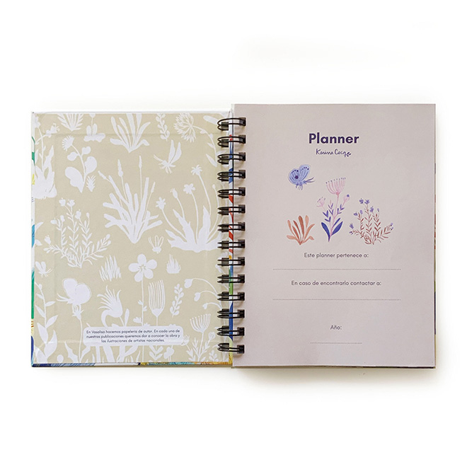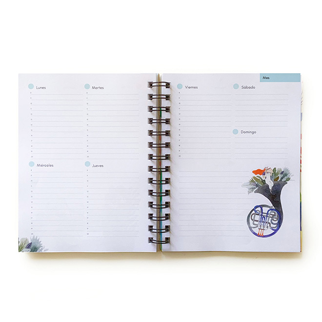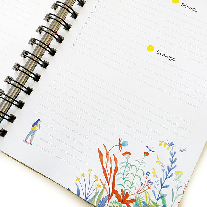 Planner con diseño Camino de la ilustradora Karina Cocq. En este planner podrás organizar tu semana acompañada por distintas ilustraciones que te llevarán por sus páginas en un viaje por mundos imaginarios pintados con acuarela.