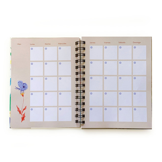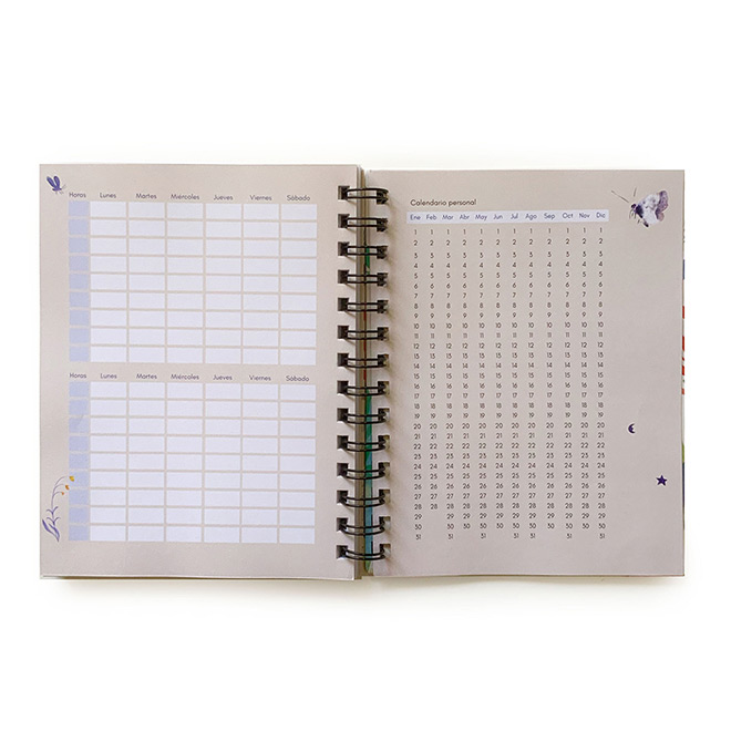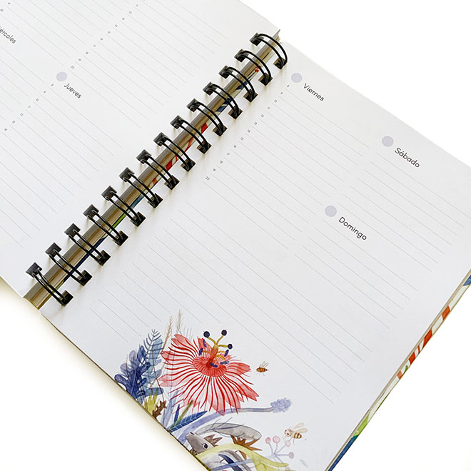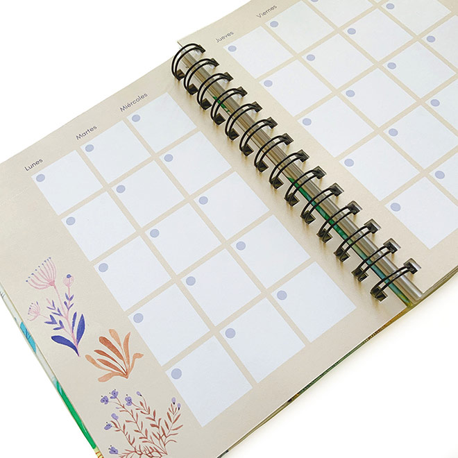 – Encuadernación: Tapa dura, espiral doble cero, elástico.