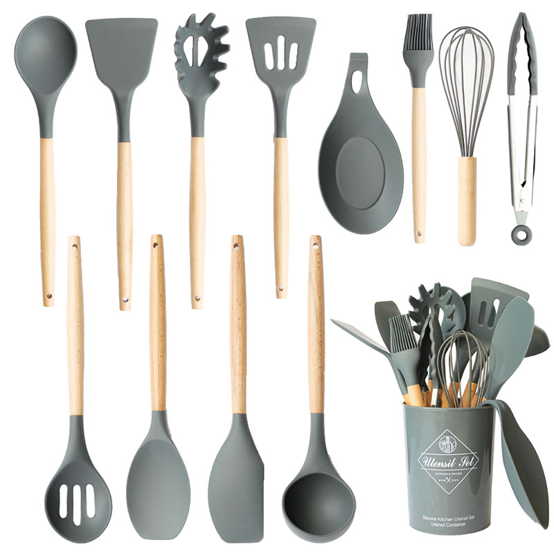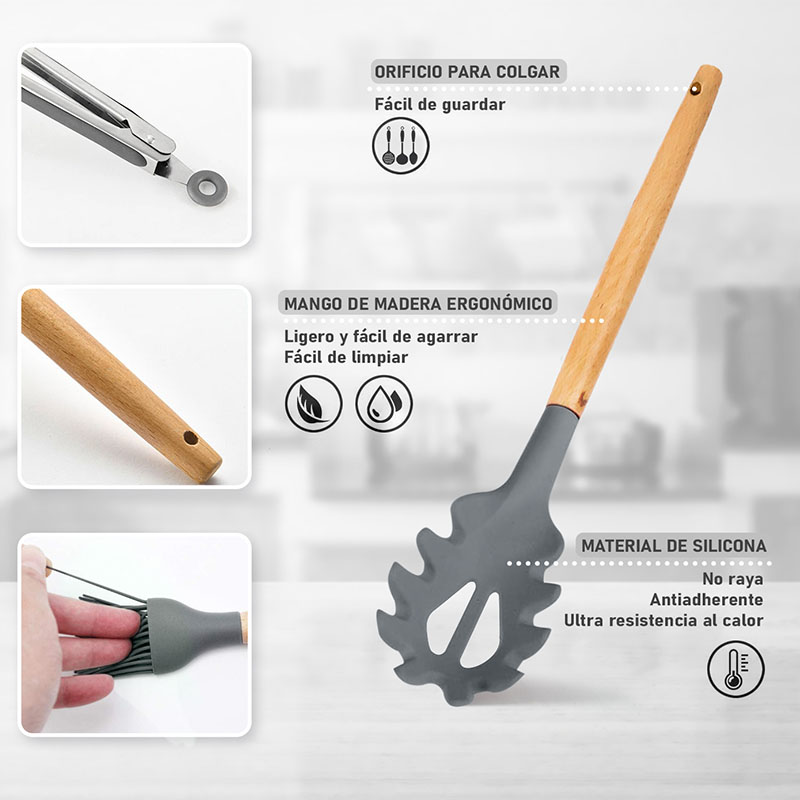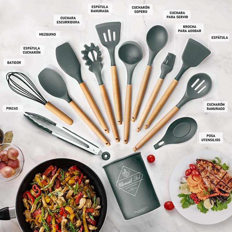 Incluye: Cucharón de sopa profundo, cucharón racionador, racionador de tallarines, batidor de huevos, mezquino, espátula flexible, pinzas, cepillo para adobar, cucharón con ranuras, espátula cucharón, cucharón sólido, posa utensilios, vaso para guardar utensilios.