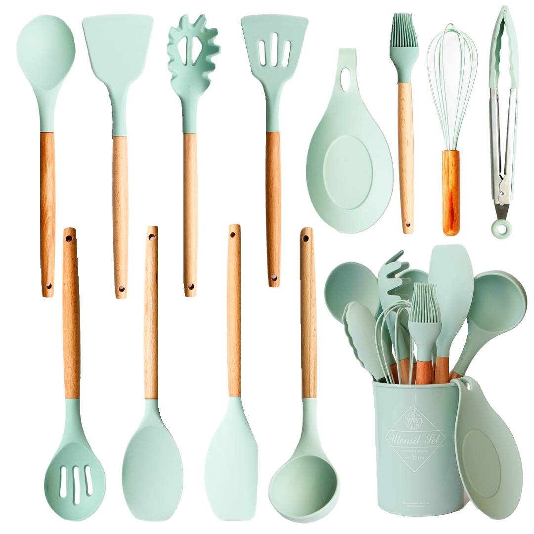 Set de 13 utensilios menta de cocina de silicona con mango de madera