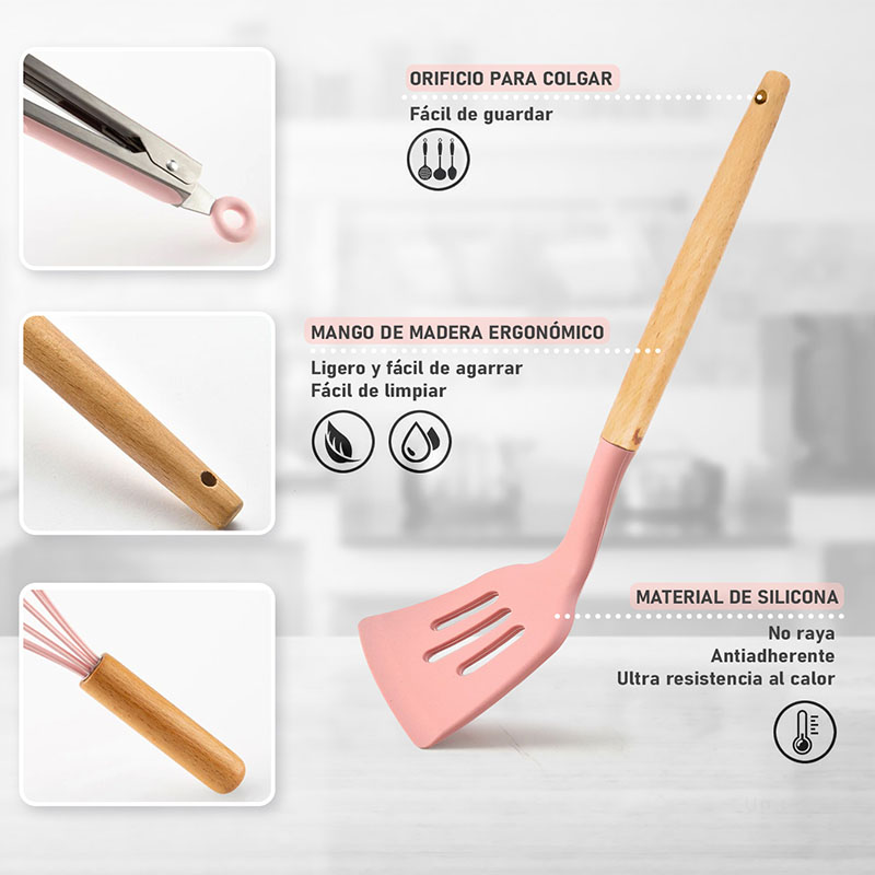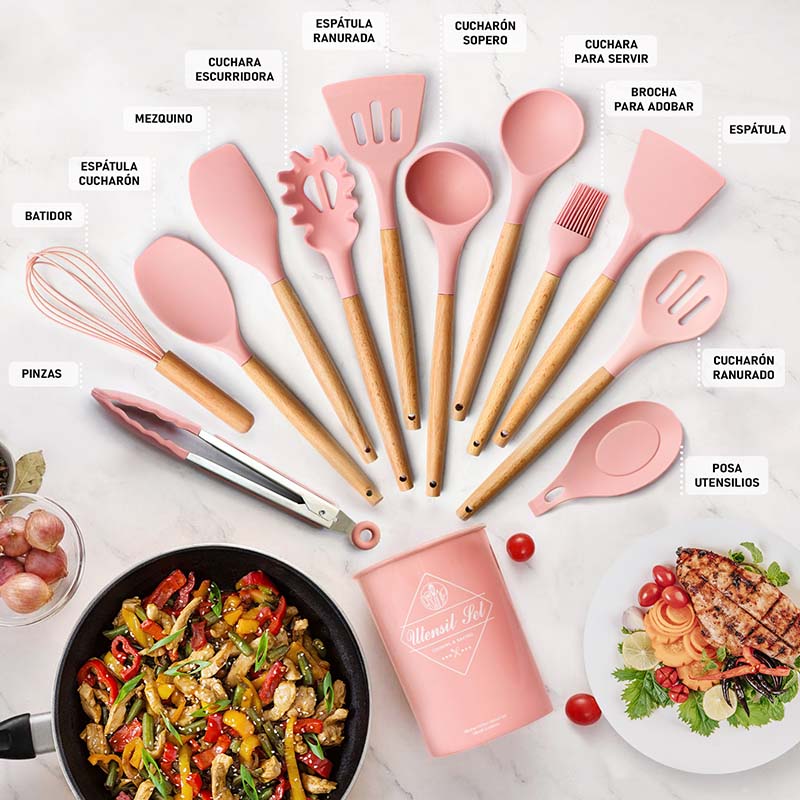 Set de 13 utensilios rosa de cocina de silicona con mango de madera