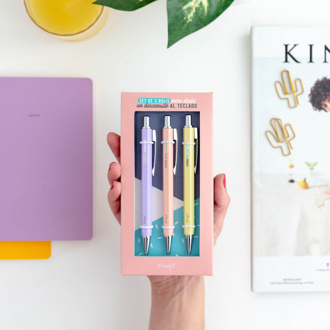 No todo van a ser mensajes de WhatsApp y correos electrónicos. Porque de vez en cuando sienta la mar de bien darle un descansito al teclado y a la pantalla digital, ¡claro que sí! Por eso hemos diseñado este estupendo set de bolis que llega dispuesto a poner la marcha, buen rollo y energía de la buena a tu estuche o escritorio. Un set que incluye tres bolis, cada uno de ellos con un color de tinta diferente: azul, negro y rojo. ¡Para que no te falta de nada!
