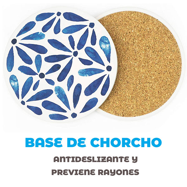 Base antideslizante: La base de nuestros posavasos están hechas de corcho, por lo que no raya superficies y permite que el posavasos no se deslice.